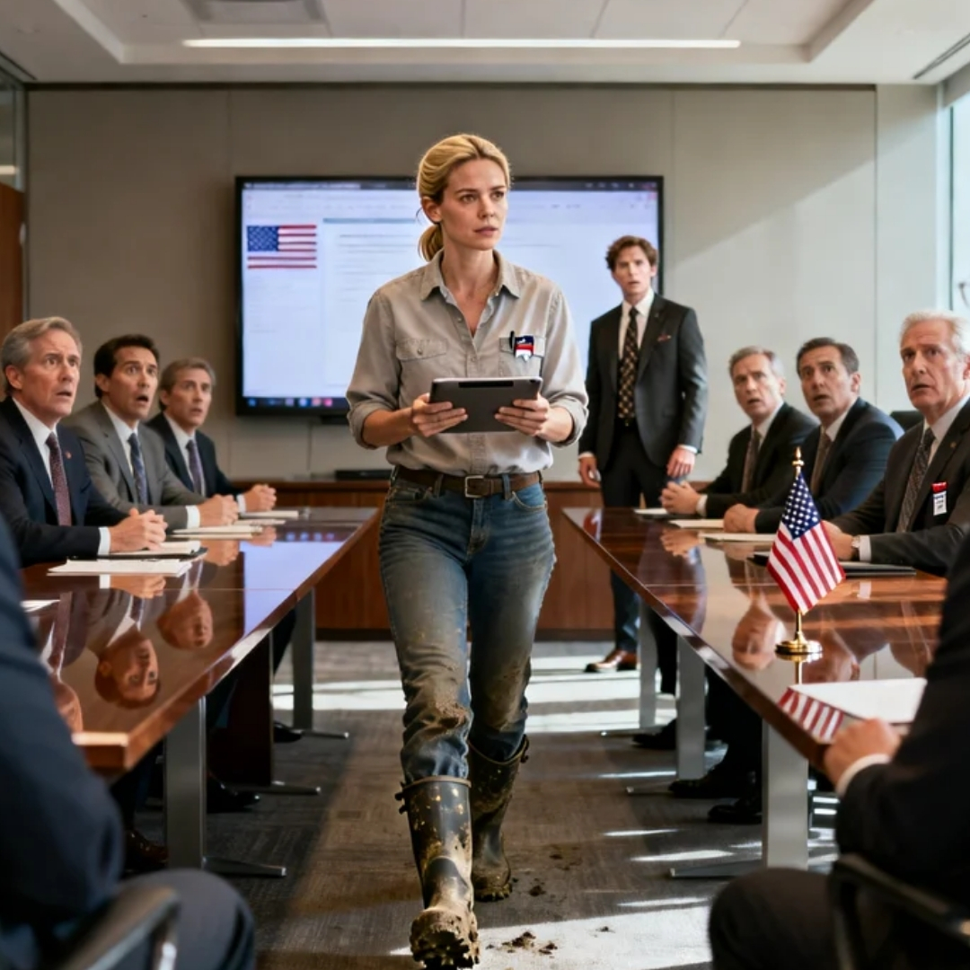 It darkened their glossy conference-room carpet in two blunt footprints—honest, unpolished, impossible to ignore—like a signature scrawled across a contract they thought they’d already won. Somewhere behind the wall of glass and steel, downtown traffic rolled through an American city that smelled faintly of espresso and ambition. Inside, men in suits stared at me as if I’d tracked in a different world.