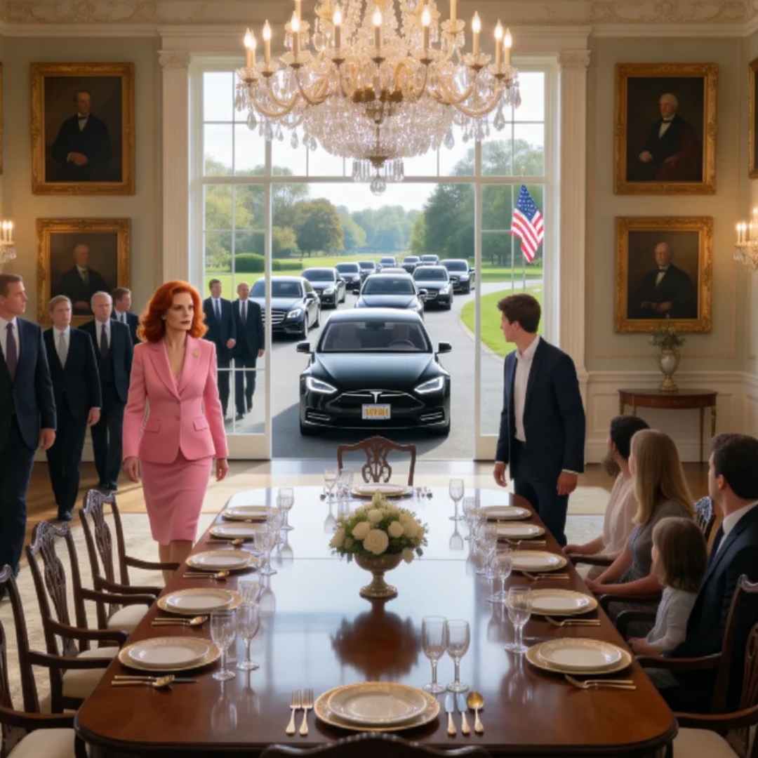 Through the floor-to-ceiling glass, black Mercedes S-Classes slid into the circular driveway like a security detail. At the front, a Tesla with government plates rolled to a stop, understated in a way that screamed authority.