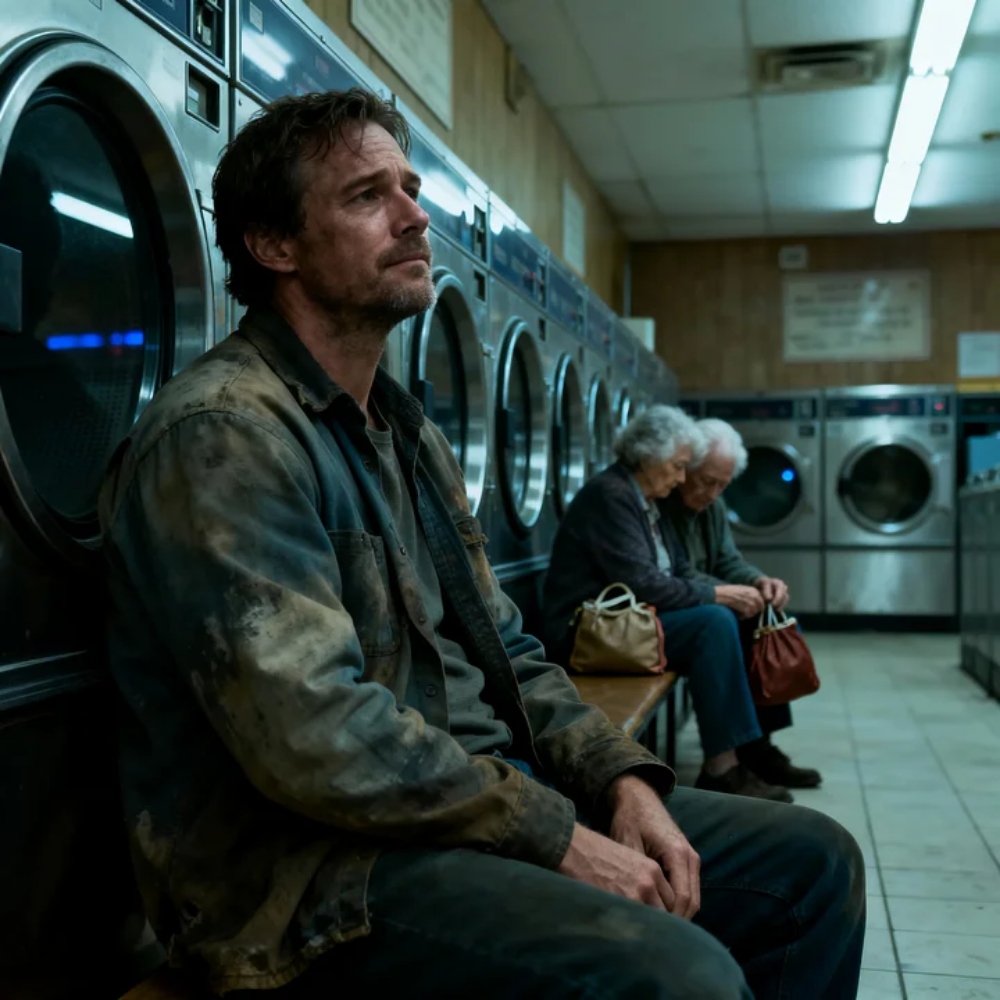 The neon sign outside the twenty-four-hour Spin & Dry stuttered like it couldn’t decide whether to live or quit, and every time it flickered, the whole room blinked blue—blue on the linoleum, blue on the steel folding tables, blue on my hands where I was gripping a mesh laundry bag like it was the only thing keeping me upright.