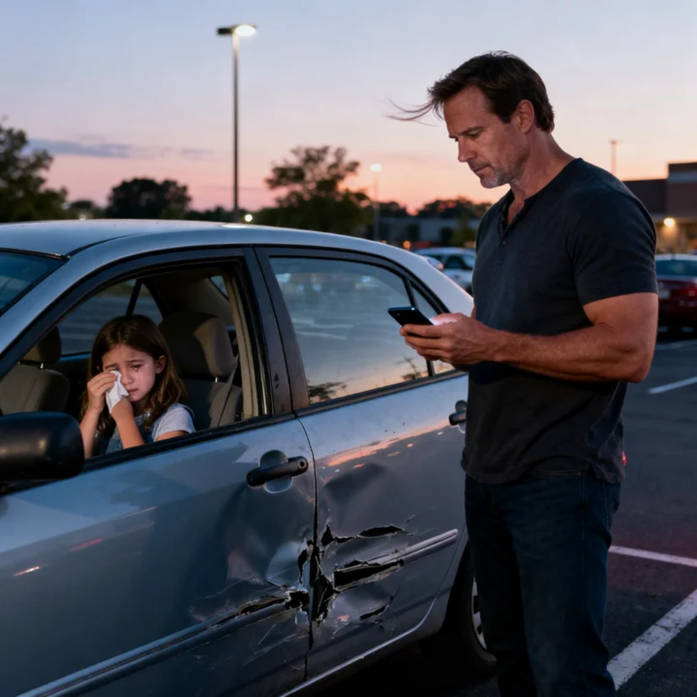 “My daughter is in that car,” I said, pointing to Sophie’s face pressed against the rear window, eyes still wide, small hands trembling. “She’s scared. This isn’t just about the dent. It’s about doing things properly. Insurance information, please.”
