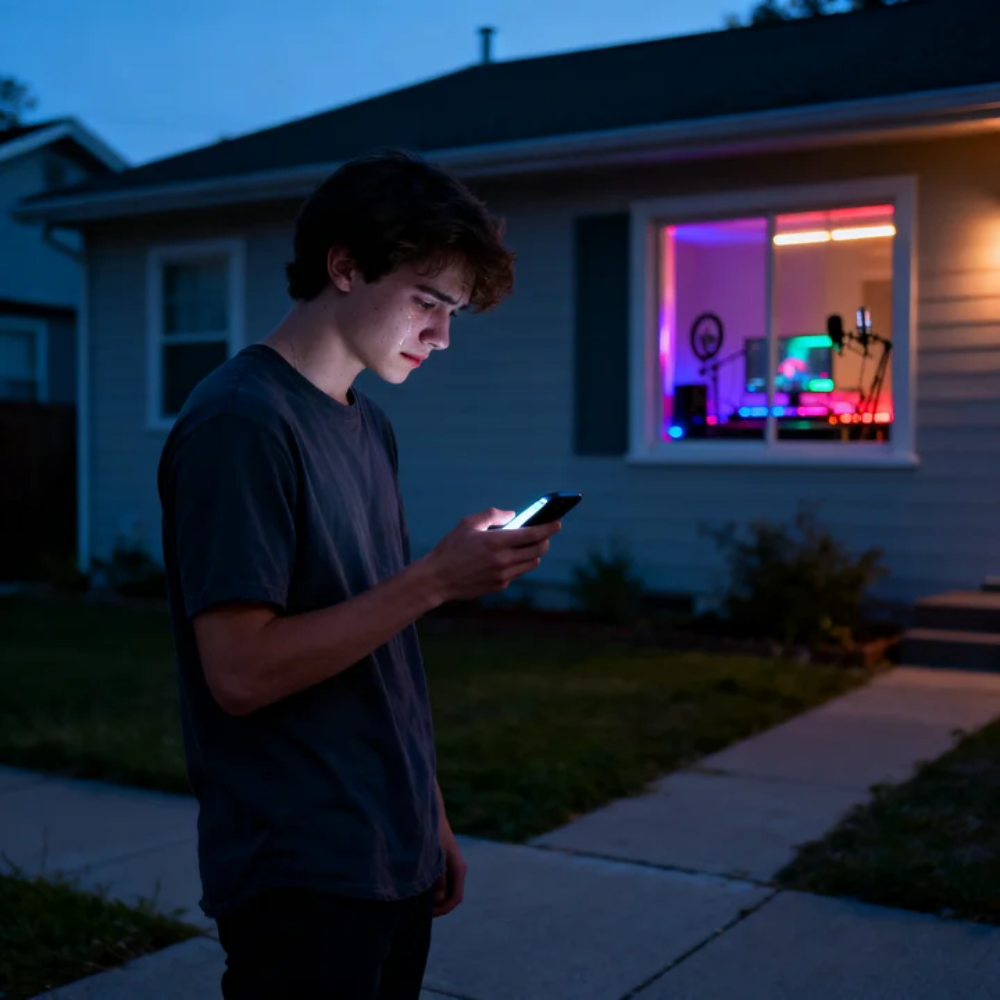 LIVESTREAM STUDIO—hot pink letters buzzing like a dare, bolted above the door that used to open into my bedroom. My bedroom. The one with the chipped white dresser I’d painted myself in high school, the one where my college textbooks still sat stacked in a corner, the one with the window that faced the maple tree out back.