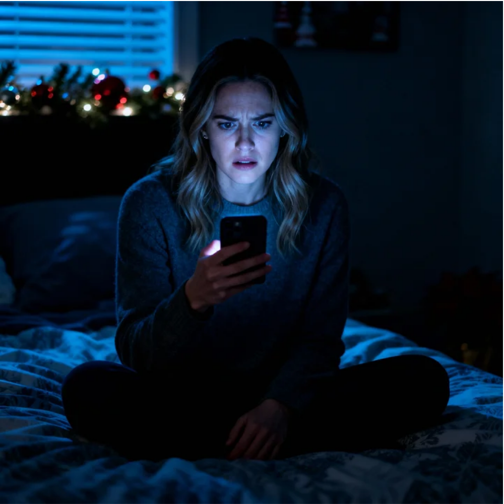 I looked toward the doorway where the blinking Christmas lights painted a pulse across the hallway wall. Red. Green. Red. Green. Like a heartbeat. Like a warning.