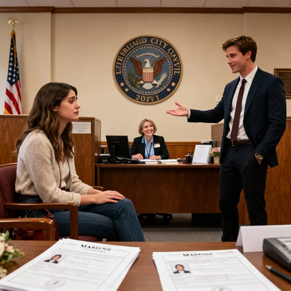 My tote bag—my proof of preparation—was at my feet. Birth certificate. Driver’s license. Forms. The stupid little box of gourmet chocolates I’d brought for the clerks because I’d wanted to start my marriage with sweetness, like a fool.