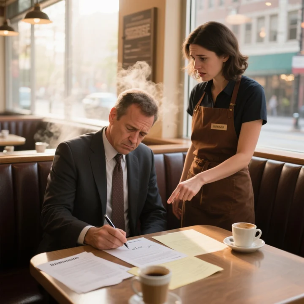Rachel didn’t flinch. She shifted the coffee pot to her other hand and set it gently on the table next to his documents, like she was laying down neutral ground.