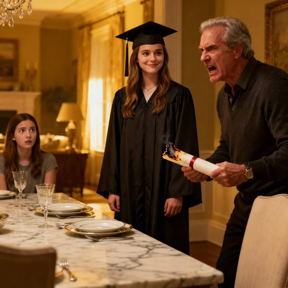 One second the private room at the downtown restaurant was full of the harmless sounds people make when they are pretending to celebrate someone—silverware touching china, a server placing espresso cups on the sideboard, my mother’s careful laugh drifting across the white tablecloth like perfume. The next, my father had reached into his leather satchel, pulled out my diploma, and held it above the candle in the center of the table with the same calm expression he might have worn while checking the label on a bottle of wine.