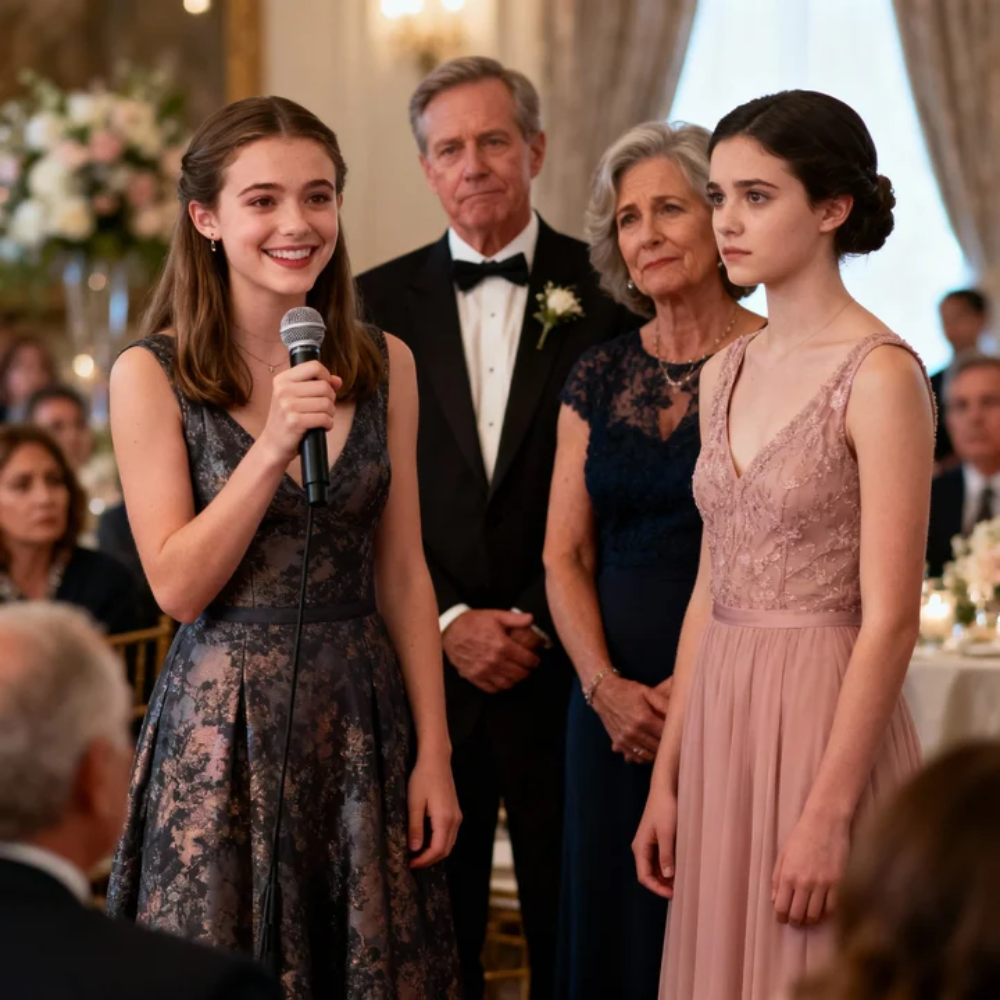 The microphone squealed for half a second—just long enough to make every head in the ballroom snap toward the stage—then my sister smiled like she’d been waiting her whole life to ruin me with one sentence.