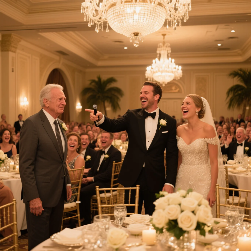 “Michael Miller,” he said, sweeping his arm toward the main table. “My father-in-law invested a fortune in this wedding. He paid for absolutely everything. The hall, the band, the food, the flowers—he even paid for personalized napkins, folks.”