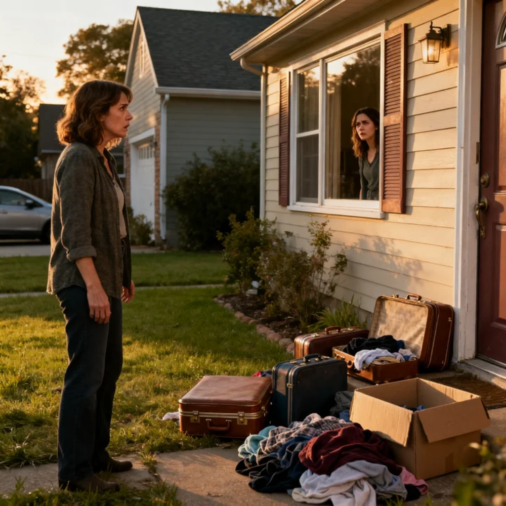 My headlights cut across the driveway and landed on a pale scatter of things that did not belong outside—cardboard, fabric, picture frames catching the light like shards of winter. For one stupid heartbeat my brain tried to file it under normal: trash pickup, a neighbor’s mess, wind damage. Then I saw my coat. Then the corner of a photo album with my handwriting on the spine. Then the edge of a box I’d packed years ago, labeled in black marker like a promise.