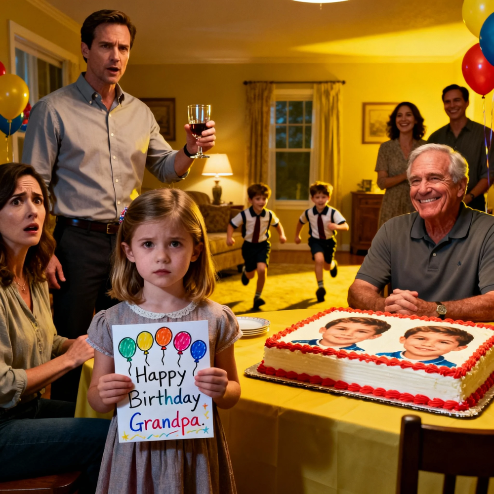 She was right next to him, in front of the table, both hands clutching the little card she had made for his birthday. It had taken her all week. She’d drawn balloons and a lopsided cake and a stick-figure grandpa with gray hair. Her “Happy Birthday, Grandpa” was written in careful, shaky letters, her tongue sticking out between her teeth while she concentrated.