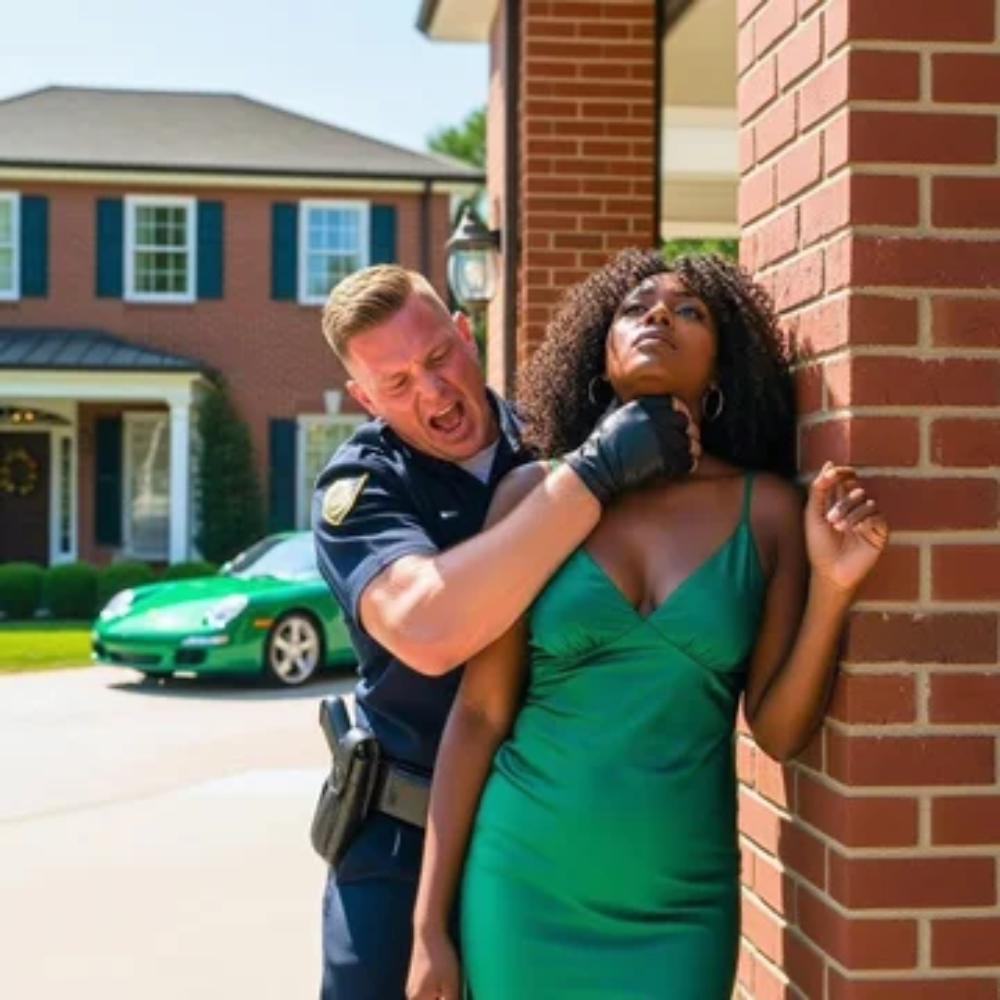 “Cheap silk,” Officer Rob Miller muttered, his voice hoarse with contempt and stale coffee. His fingers tightened on the emerald fabric at her collarbone as much as on her neck. “You think you can roll into my neighborhood, driving that car, dressed like this, and not pay a price?”