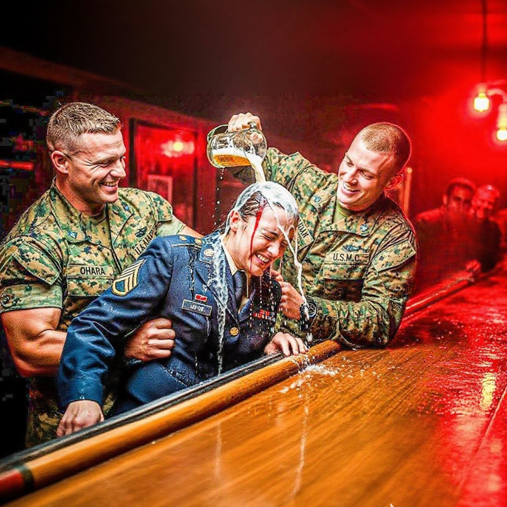 “Drink it,” the Marine who’d thrown the glass drawled, his voice thick with bourbon and bravado. His dog tags flashed at his collar as he grinned. “C’mon, you’ll look cuter if you loosen up.”