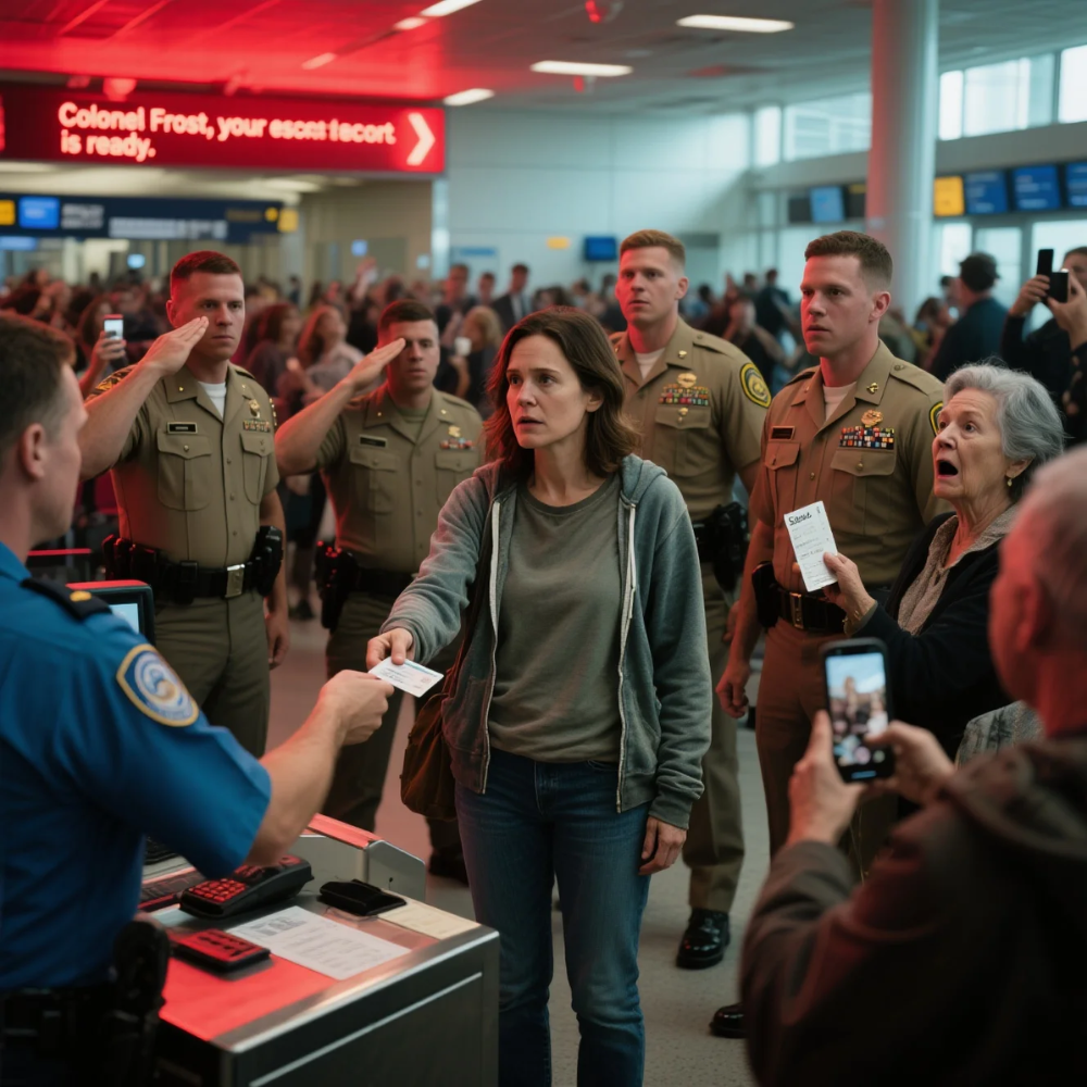 The tallest of the officers stepped forward, glanced at the screen, then at my ID. His posture shifted. He squared his shoulders, tapped his earpiece, and his voice came out clear enough to cut the airport noise in half.