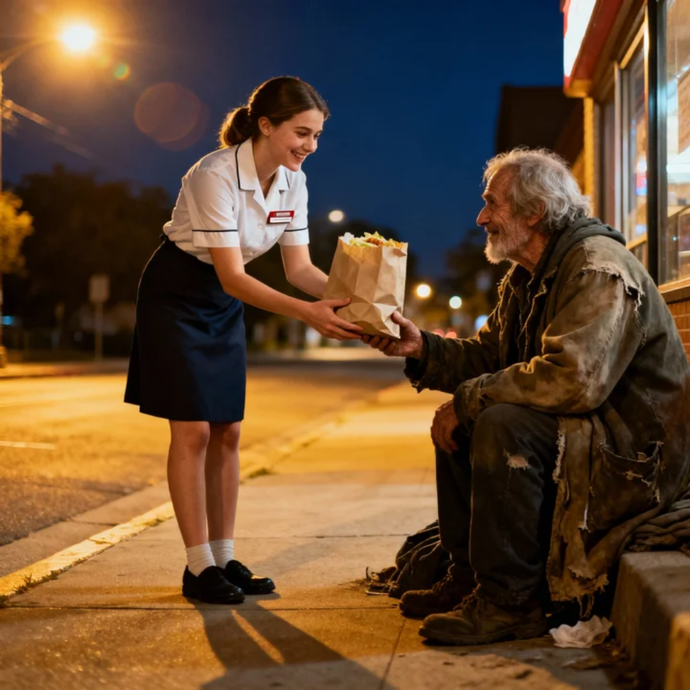 That night, Rachel went back inside, packed what was left after shift meal—soup, bread, a piece of chicken that would have ended up in the trash—and carried it out like she was smuggling a secret. When she offered it to him, he looked up at her as if he hadn’t expected the world to remember him. Gratitude flickered across his face so sharply it hurt to see.