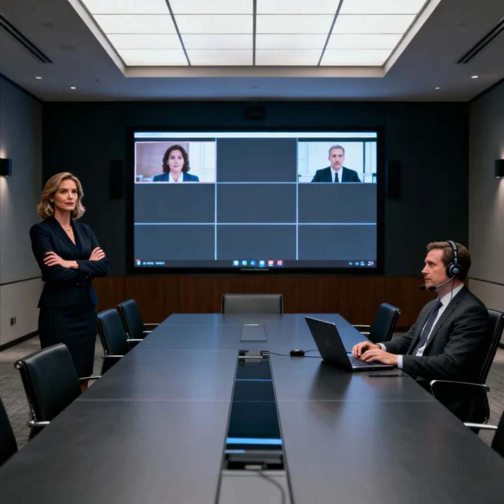 A few of the faces on the conference wall changed instantly. One CEO stopped writing. Another leaned toward his microphone. A lawyer on one screen lowered his glasses and turned a page he had already read.