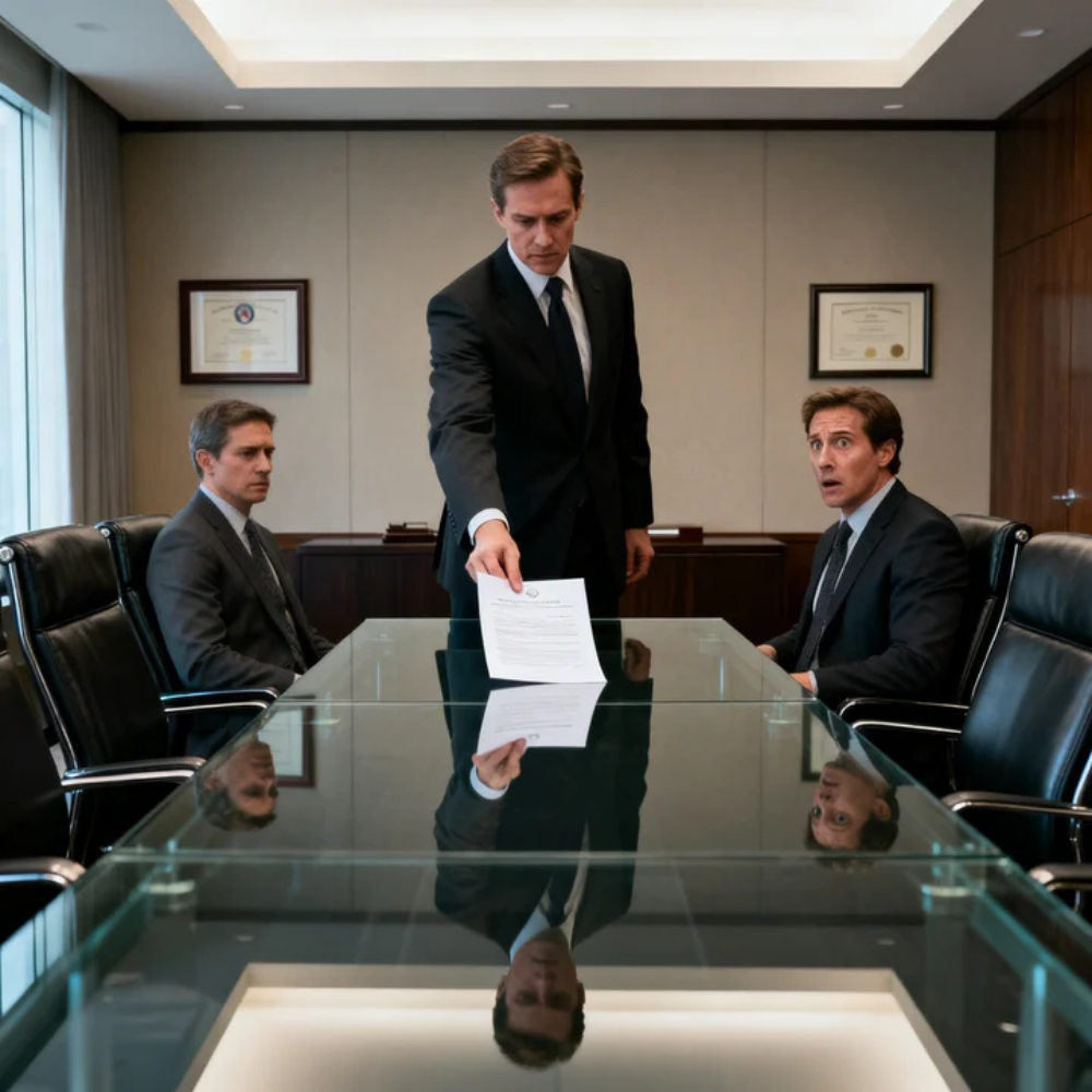 The boardroom was long and cold, polished mahogany and quiet power. Chad sat at the far end, suddenly small. The bravado from the balcony had evaporated.