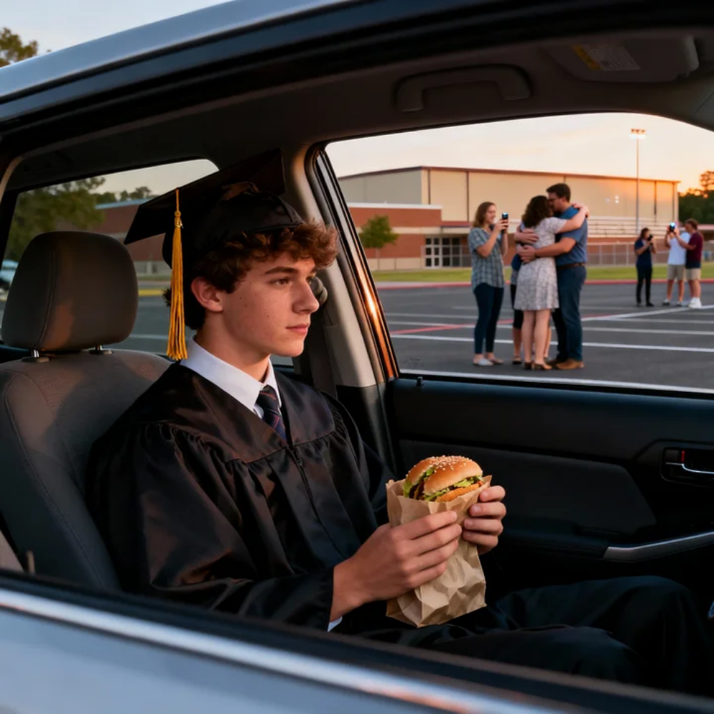 The gym doors burst open like a dam breaking—families flooding out with balloons, bouquets, and camera flashes—while I sat alone in the farthest corner of the parking lot with cold fries on my lap and my hands gripping the steering wheel like it was the only thing keeping me from falling apart.
