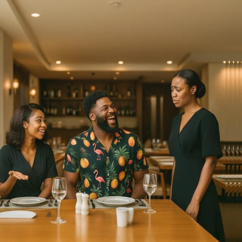 Aisha stood with perfect posture, tray balanced effortlessly in her gloved hands. Her crisp white uniform looked almost too formal for the warmth of the dining room, but she wore it with a dignity that had nothing to do with fabric or color. Even so, her eyes—dark and soft—betrayed the storm rising beneath her skin. Shame. Hurt. A flash of something like disbelief. She had been mocked before, sure. Anyone working the night shift in an American restaurant learned quickly that some customers walked in hungry for more than food. But this sting felt sharper. More personal.