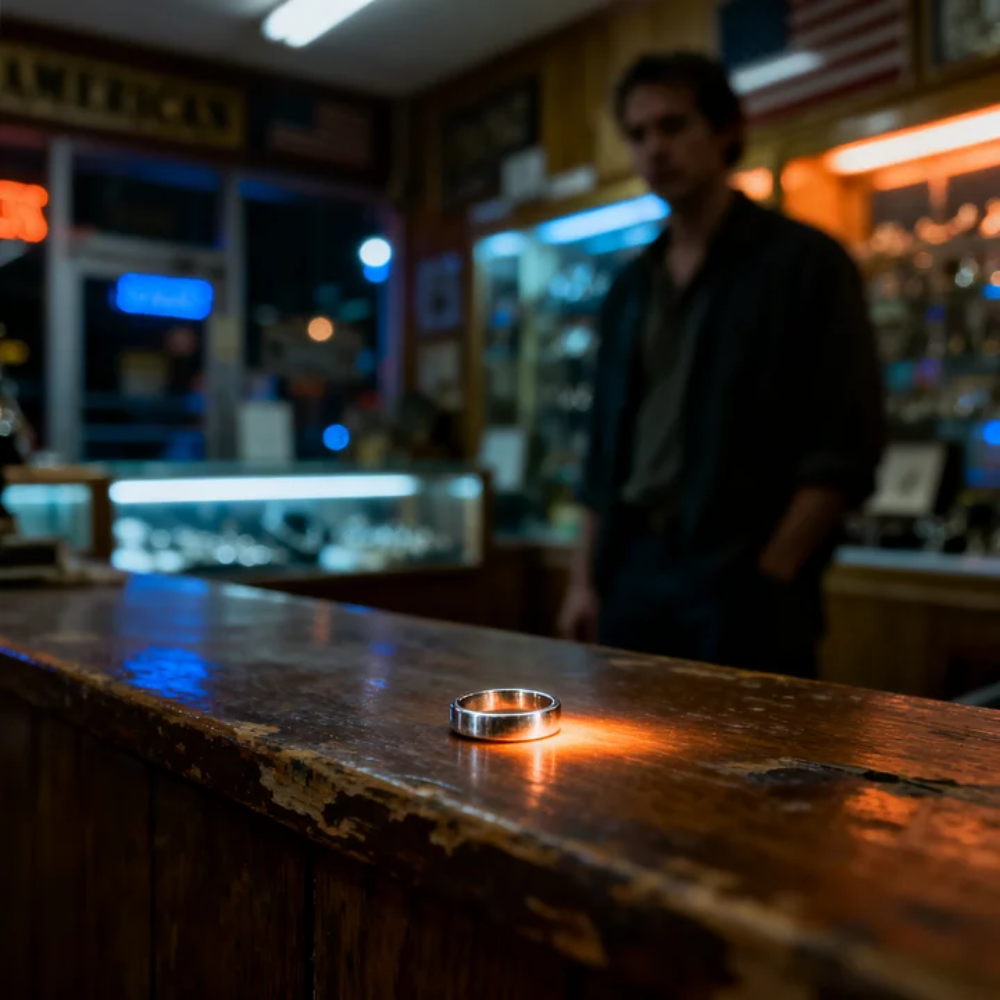 The shop smelled faintly of metal polish, dust, and old paper. A small TV in the corner played a Phillies recap with the volume low. Behind the counter, an older man with a broad back and reading glasses was doing paperwork while rain tapped steadily against the front window. I drifted toward the jewelry case because that’s what people do when they’re half-browsing and half-waiting for time to pass. Most of it was forgettable. Heavy rings with fake stones. Tiny diamond studs. Gold chains with broken clasps. Then I saw the silver band.
