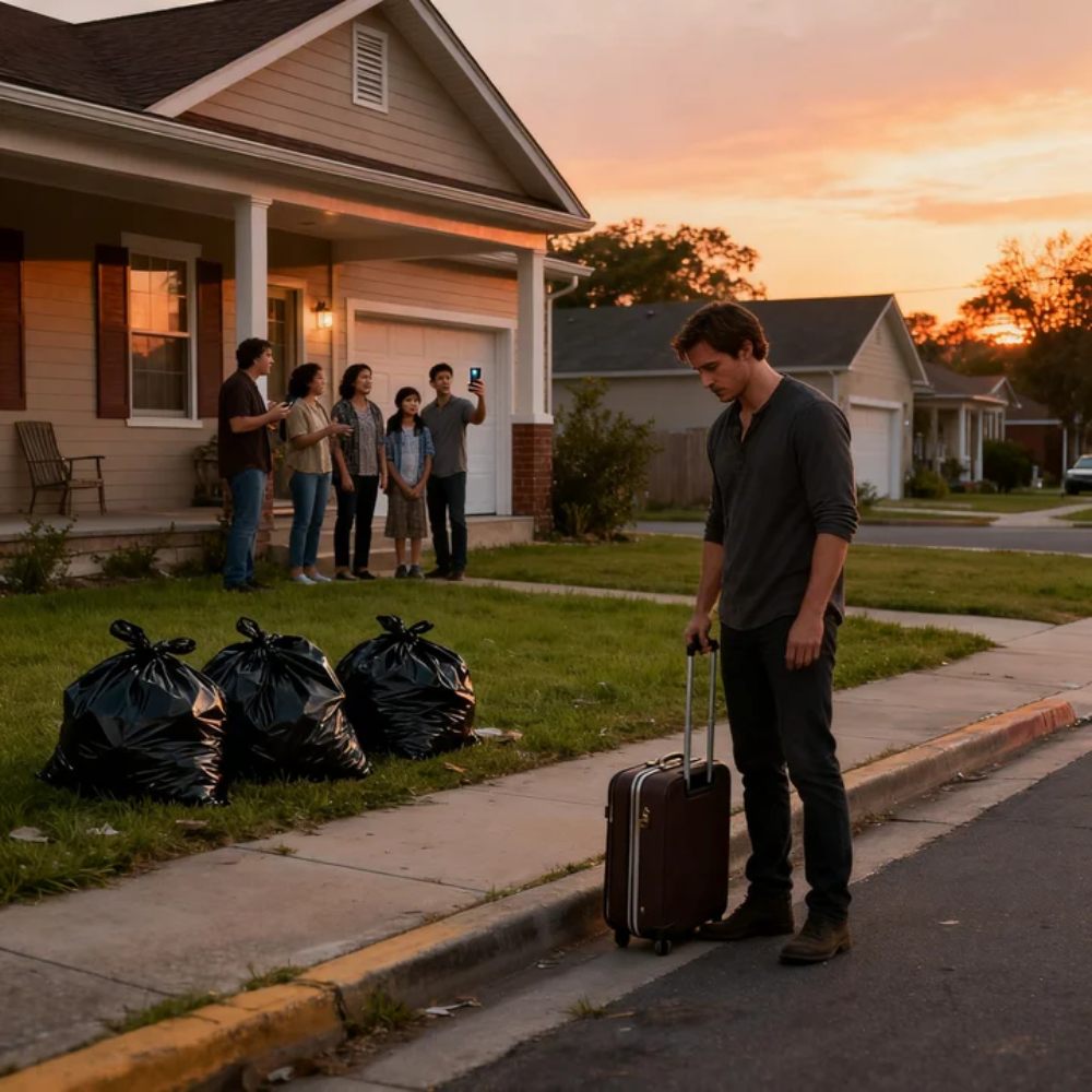A woman came home from a night shift at an American 911 call center and found her belongings in garbage bags on the lawn while her family filmed the scene for laughs. They called her a loser, a freeloader, a burden, even as they had been using her paycheck, her credit, her labor, and her love to prop up the life they claimed she was ruining. She took the bus out of town with two wet dollars in her pocket. She slept on a friend’s couch. She found the truth in the numbers. She cut the cords quietly. She let a house built on exploitation feel its real weight for the first time. She built her own life. She let the right people see who her family really was. Then, when the same people who mocked her came begging for rescue, she stood on the courthouse steps, bought the house herself, and turned the place where she had been broken into a place where other exhausted people could heal.