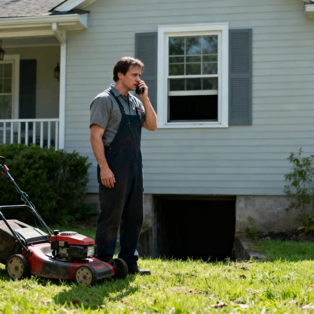 I moved to the window and looked out. Gary stood near his mower, phone pressed to his ear, staring at the small basement windows that sat just above ground level along the front of the house. Those windows had always looked harmless to me—small, fogged sometimes, framed in concrete wells with a little metal grate. Just basement windows.