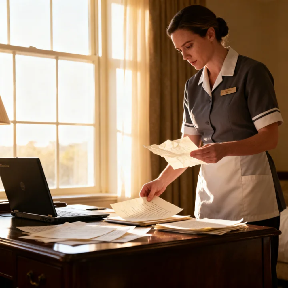 The rest of the shift passed in a fever. I cleaned twelve more rooms. Refilled mini bars. Collected towels. Smiled at guests. Said excuse me in hallways. Restocked carts. Clocked out at four-thirty. Rode the train home with those pages folded in my jacket like contraband.