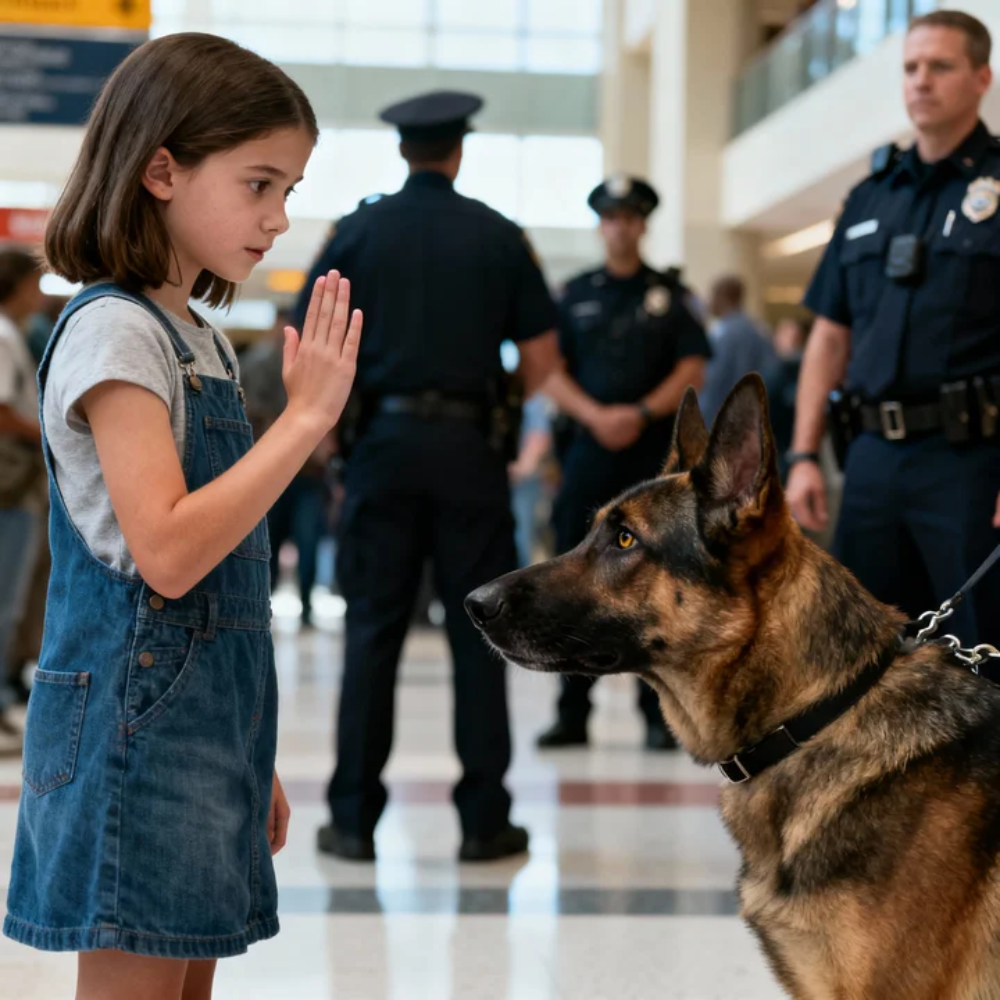 For a split second the airport around them kept breathing—wheels ticking over tile, gate agents calling names, the overhead voice droning through a muffled announcement about a delayed flight to Denver—but Rex didn’t. The German Shepherd went statue-still, ears speared forward, chest lifted, tail low, eyes locked on something deep in the crowd like he’d just seen a ghost step into daylight.