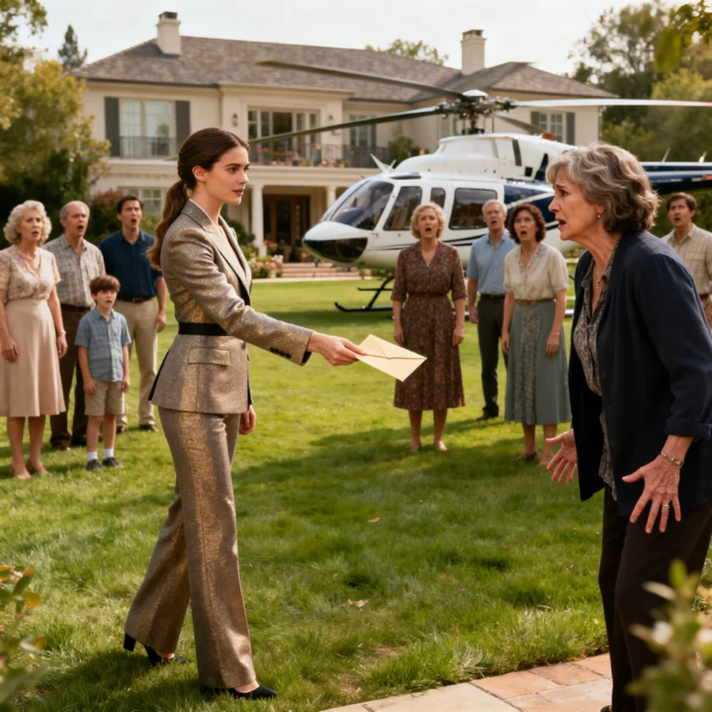 The helicopter came in low over the maples, its blades chopping the humid summer air into frantic ribbons, and for a moment the whole front lawn looked like it was breathing—grass flattening, dust spiraling, napkins skittering off the patio table like startled birds. Someone’s iced tea trembled so hard in a mason jar that the ice clinked like nervous teeth. My father’s guests—people who used to speak over me as if I were furniture—stood frozen on the brick walkway of his suburban Chicago home, mouths half open, eyes wide, as if the sky itself had decided to answer every insult they’d ever thrown at my daughter.