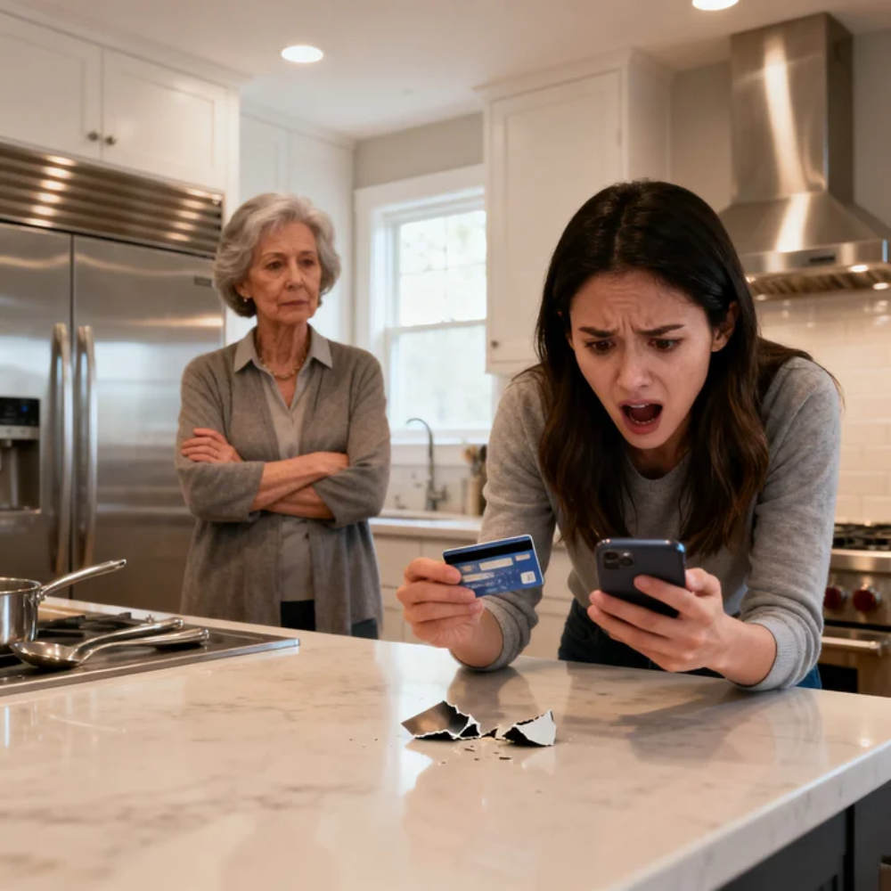 Amanda’s voice cut through the air, sharp, furious—unrecognizable. In one violent motion, she tore my credit card in half and flung the pieces onto the granite countertop. They skidded across the surface, one half spinning to a stop beside the fruit bowl, the other landing near my trembling hand.