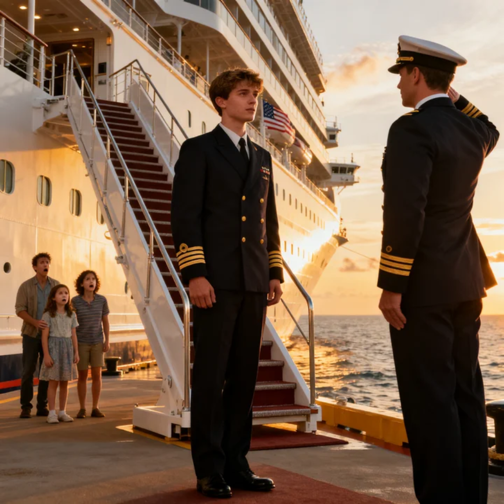 The Marlin Star towered above the dock like a floating hotel polished for magazine covers—seven decks of silver-white steel, brass rails, smoked glass, and soft money. Cameras hovered overhead on drones. Floral arches framed the gangway. A violinist froze with his bow suspended in the air. My father’s guests—investors, lifestyle press, family friends with old coastal money and newer Instagram faces—turned in one slow, shared motion toward the restricted gate where I stood in navy uniform, one hand on a leather satchel, salt wind lifting the edge of my collar.