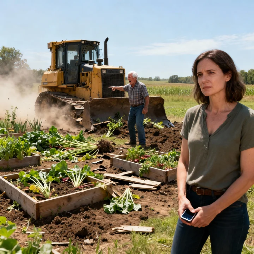 He didn’t stop. He didn’t even flinch. The bulldozer kept rolling, the blade lifting a neat, cruel strip of my work and tossing it aside. My irrigation line snapped with a wet pop. Water geysered up for a second, spraying the air like a fountain that didn’t understand it was dying.