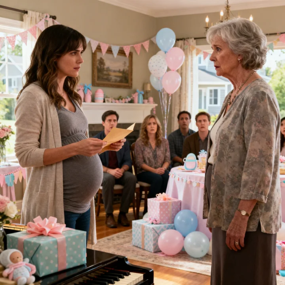 It was glossy white, sealed with a neat strip of lavender ribbon, and it landed in my hands like a dare—right there in the middle of my baby shower, in front of fifty people, with my belly seven months round under a mint-green dress and the living room buzzing with laughter, champagne flutes, and the sugary smell of cupcakes.