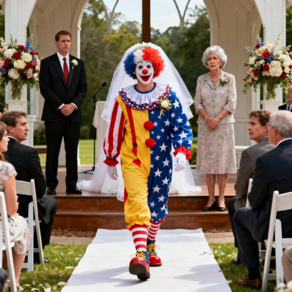 Under it: a red foam nose, a striped shirt, suspenders, ballooning polka-dot pants, shoes the size of small boats, everything screaming for laughter in a room that had been arranged for vows.