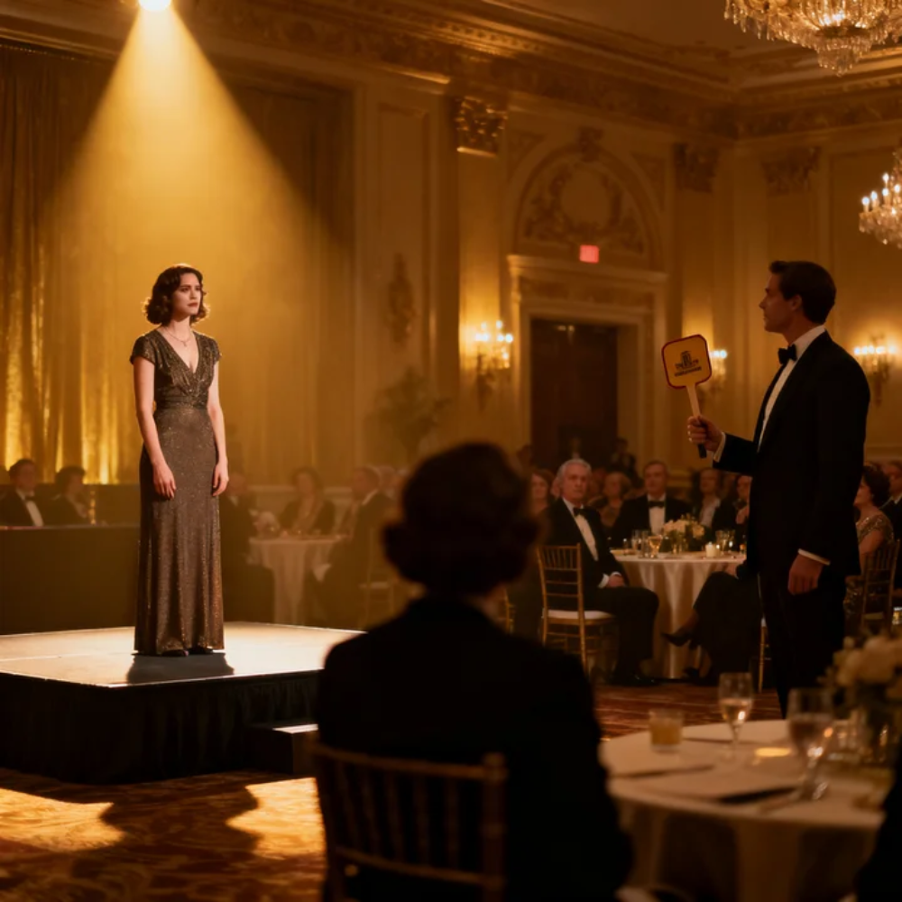 The stage lights at the Magnolia Hotel in downtown Omaha were so bright they bleached the color from my skin and turned the polished ballroom floor into a sheet of liquid gold. Snow hammered against the tall windows overlooking the Old Market district, and beyond the glass the Nebraska blizzard swallowed the city in white. Inside, crystal chandeliers trembled faintly from the hum of conversation and clinking champagne flutes. Two hundred members of Omaha’s wealthiest families sat at round tables draped in ivory linen, waiting for a spectacle.