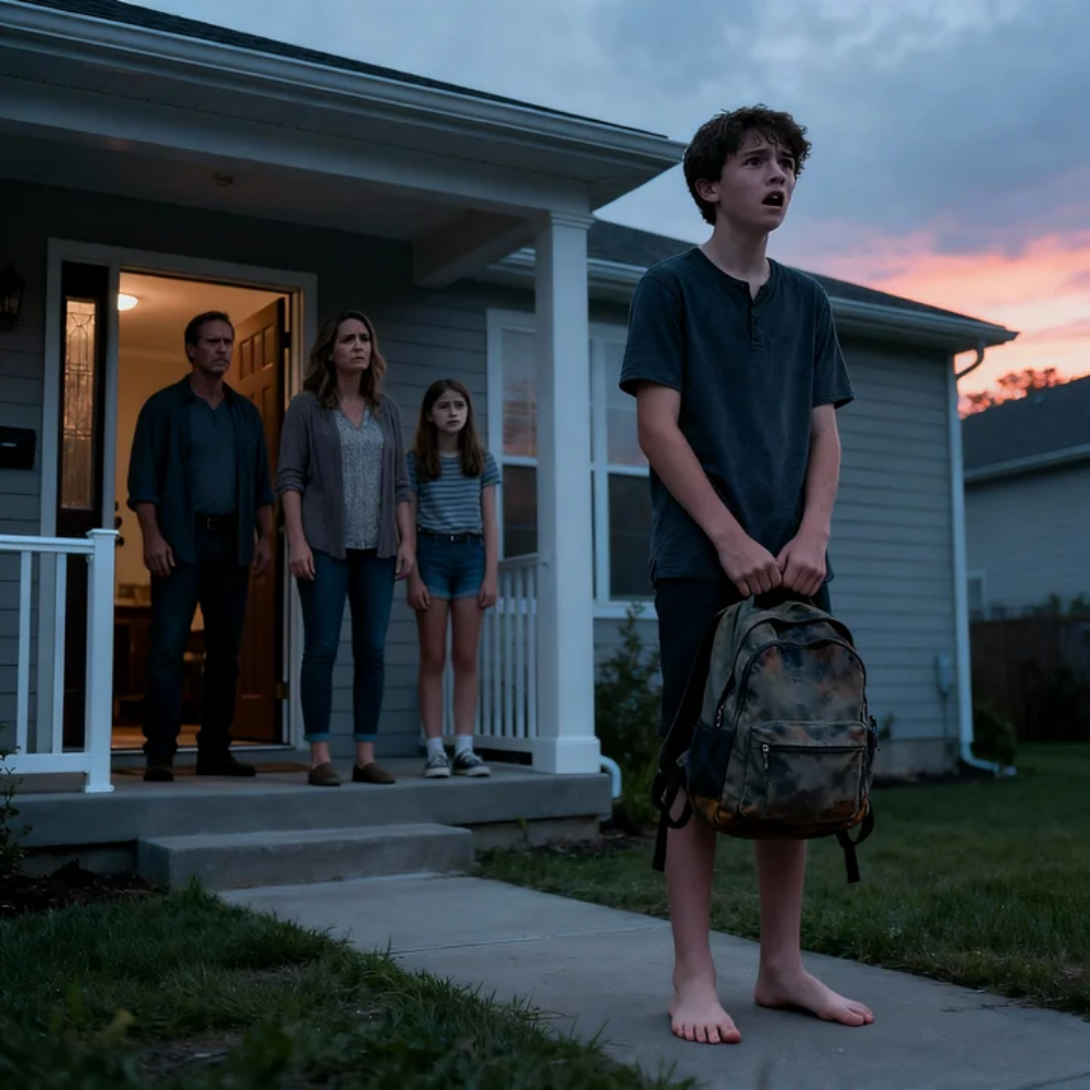 Rain didn’t fall that night so much as it hunted—cold sheets of it snapping sideways across our little Ohio street, turning the porch light into a blurry halo and my bare feet into two numb, burning anchors on the concrete. My sister was crying in my mother’s arms like she’d been shot. My father was shouting my name loud enough for the neighbors to look out through their blinds. And I was sixteen, shaking in a soaked T-shirt, holding a trash bag of clothes like it was the last proof I existed.