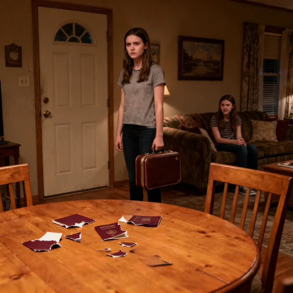 It sat on the kitchen island in the middle of that overlit suburban Ohio house like some ugly little machine built for ritual sacrifice, its motor whining as it chewed through the last thick strip of navy-blue paper. My passport. My face. My future. The photo page came apart in white and blue ribbons, then spilled out into the clear plastic bin beneath the blades like expensive confetti.