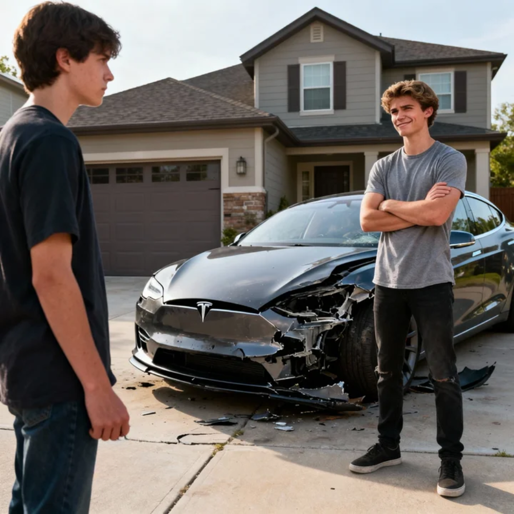 He stepped outside, saw my Tesla parked out front, and his eyes lit up in a way that made my skin crawl. He circled it slowly like it belonged to him already, leaning against the hood with that careless entitlement he wore like cologne.