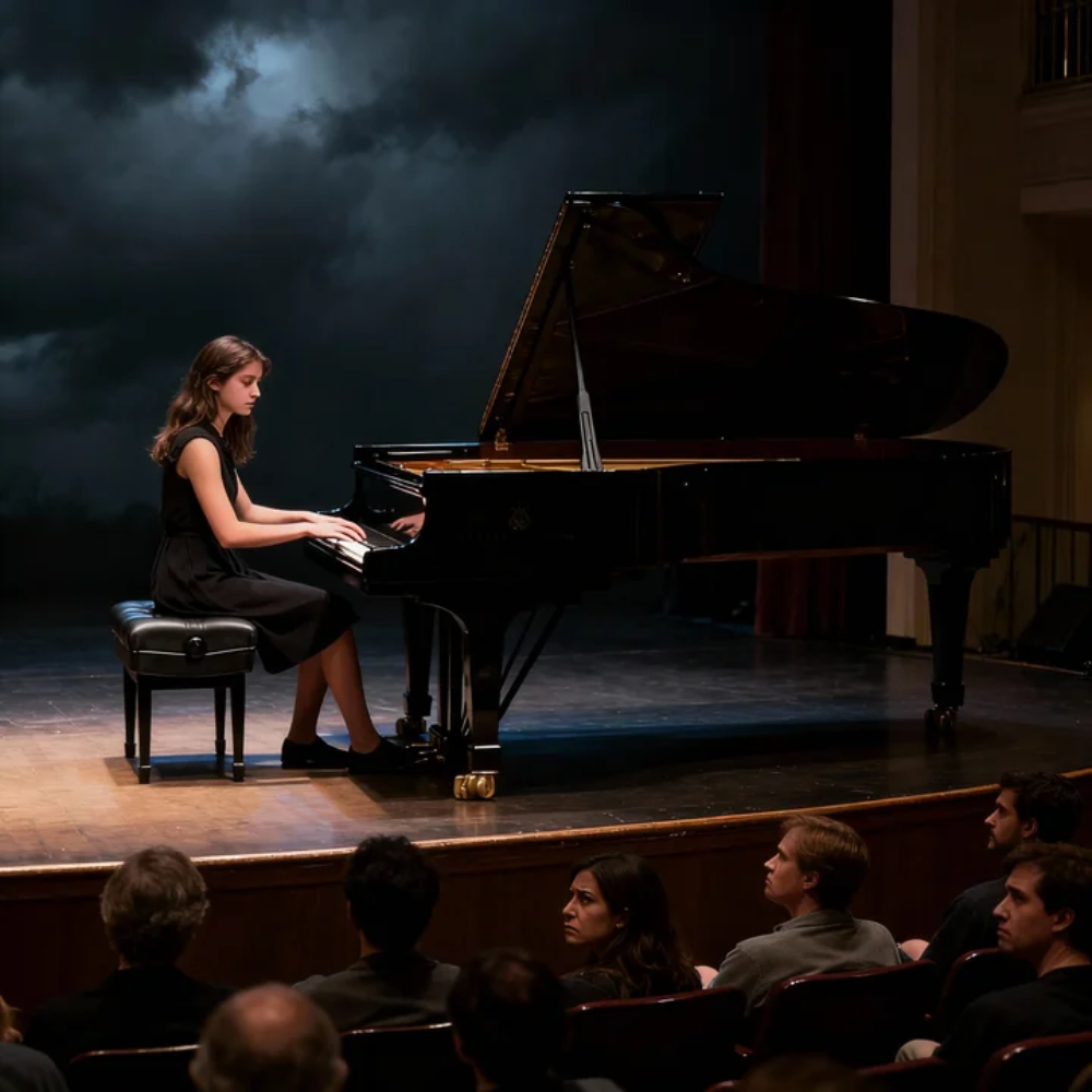 The young woman stepped to the grand piano. This one was even more magnificent than the gala’s—stage lights catching the lacquer, turning it into a pool of night.