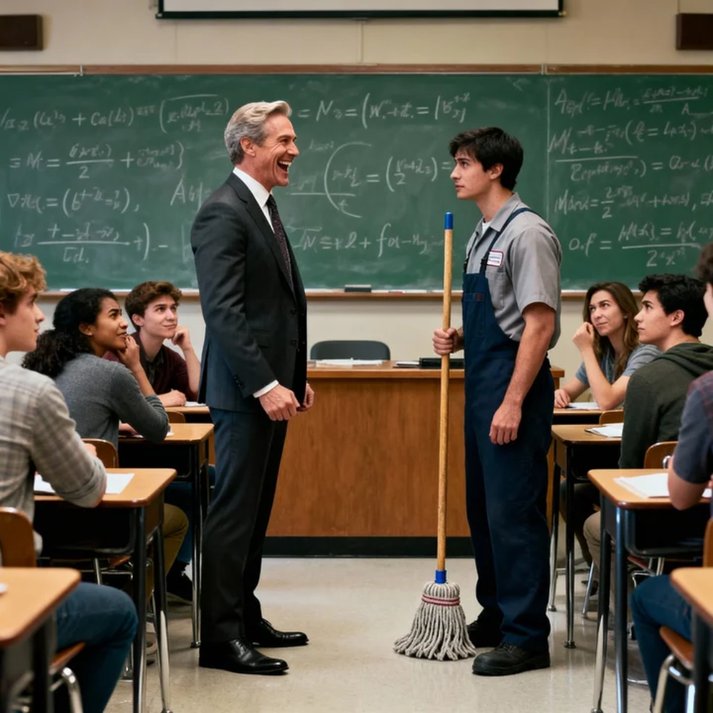 Holden Carroway pushed it quietly, eyes down, uniform plain, keys clinking against his belt. He’d been assigned to sanitize the desks and wipe the door handles after the morning block, a routine task in a campus that treated cleanliness as an invisible miracle. Thirty pairs of eyes flicked to him and away like he was a glitch in a polished screen. That was the rule here: the people who kept the place running were background noise.