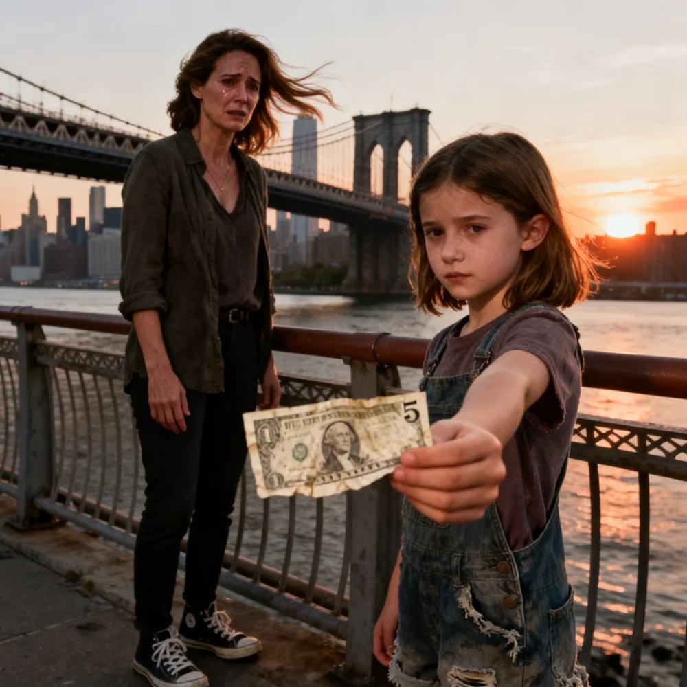 In her fist, she clutched a crumpled five-dollar bill, rain-soaked and wrinkled like it had been carried a long way.