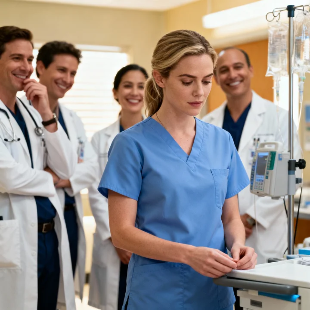 Dr. Caleb Sterling—second-year resident, hair always perfect, confidence always loud—laughed without looking up from a chart. “HR must’ve hired her as a charity case,” he said. “Or a diversity box. I asked for a larger IV during intake and she stared at the tray like it was written in another language. Five seconds. Five seconds is forever when a patient’s crashing.”