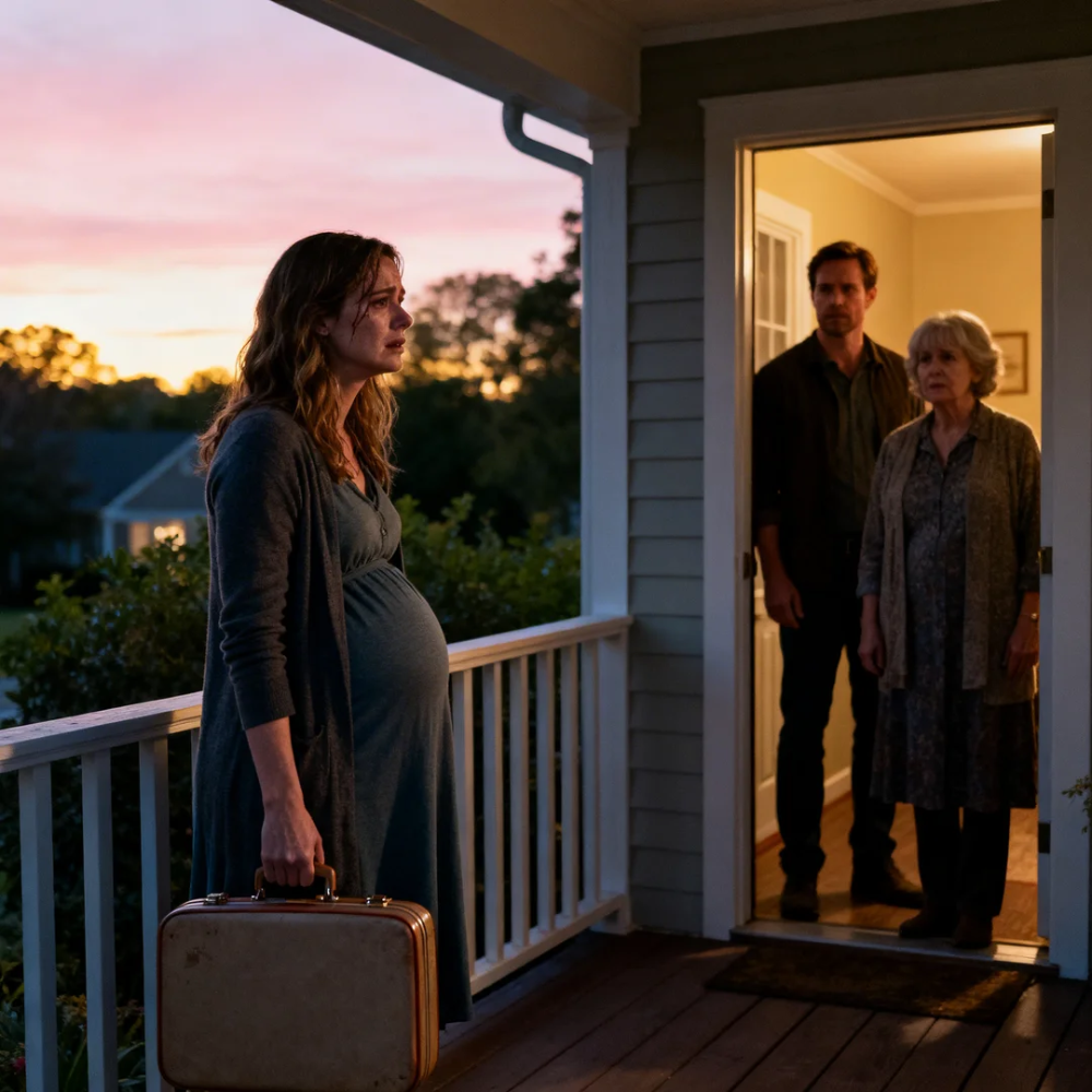 Patricia—his mother, sharp as broken glass and twice as cold—hooked a foot under Annie’s suitcase and kicked it down the slick steps with the satisfaction of someone taking out trash on a Tuesday. The case hit the bottom stair, burst open, and scattered Annie’s life across the muddy lawn: a worn sweater, a pair of drugstore flats, a photo strip from a long-forgotten fair. Mark laughed anyway. It was loud, ugly, and deliberate, timed so the neighbors’ porch lights would catch it.