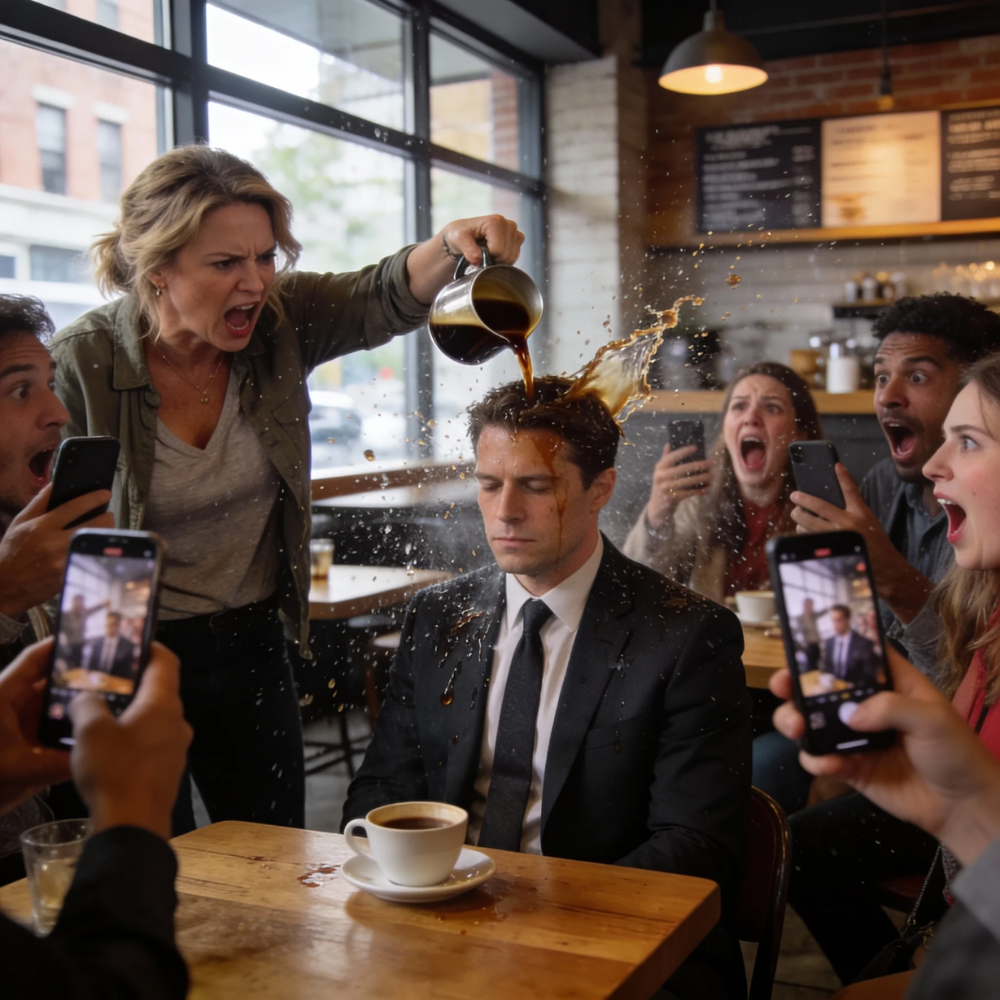 Heat struck first. Not the smell, not the splash—heat. A sheet of fresh-brewed coffee poured straight over my head, scalding my scalp, racing down my neck, soaking through my thrifted gray hoodie like it had been waiting all my life for the chance to brand me.