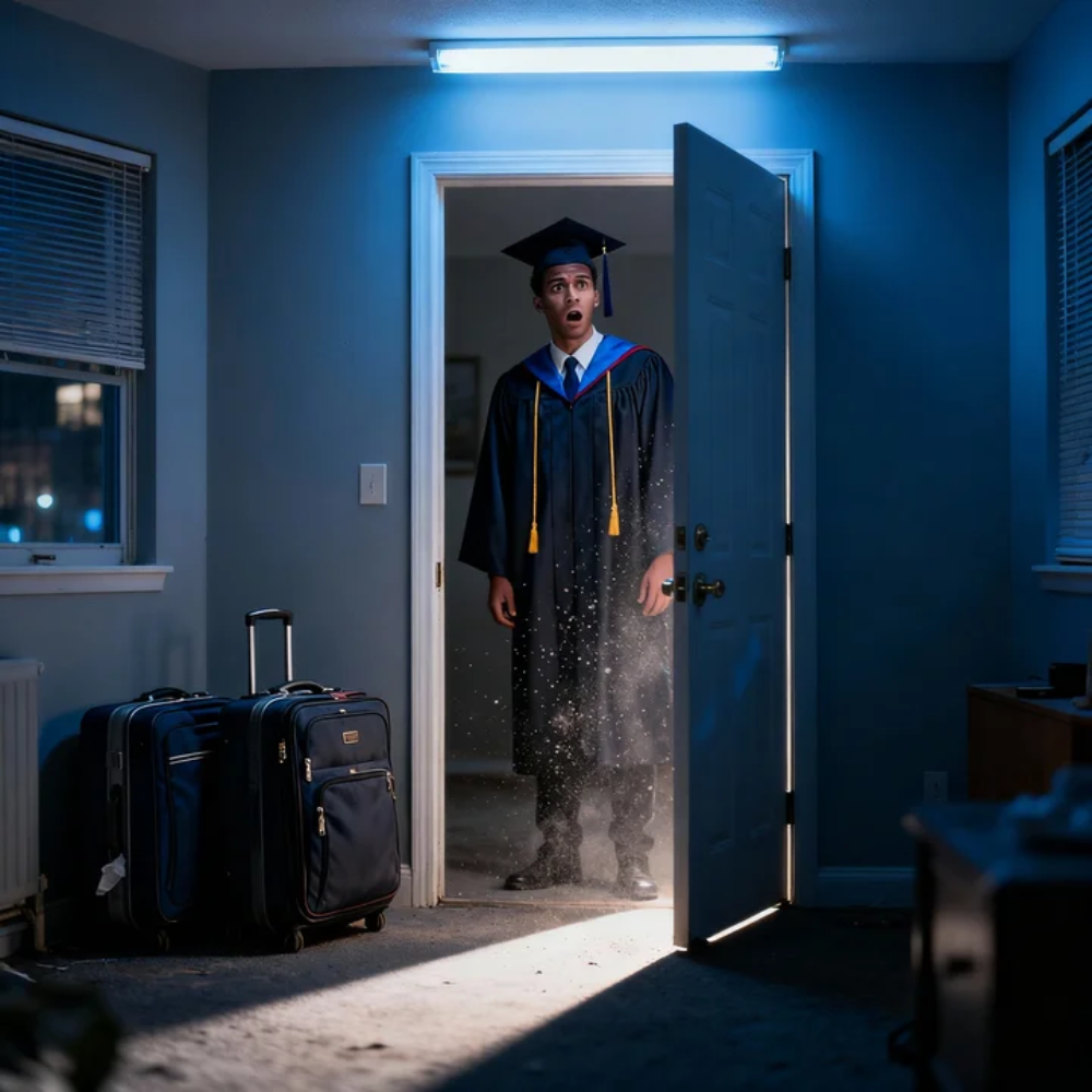 I opened my eyes to a strip of early light cutting through the blinds, pale and indifferent. The city outside was waking up the way it always did—distant sirens, a garbage truck groaning in the alley, someone’s car alarm chirping and dying. In our bedroom, though, the air felt staged, like the scene had been dressed overnight. His suit jacket hung over the back of the chair. The graduation gown—folded neatly, as if it mattered—rested over the arm of the couch where I could see it from bed. A little cluster of balloons leaned in the corner by the door, helium strings taped down like they were waiting for permission to rise.