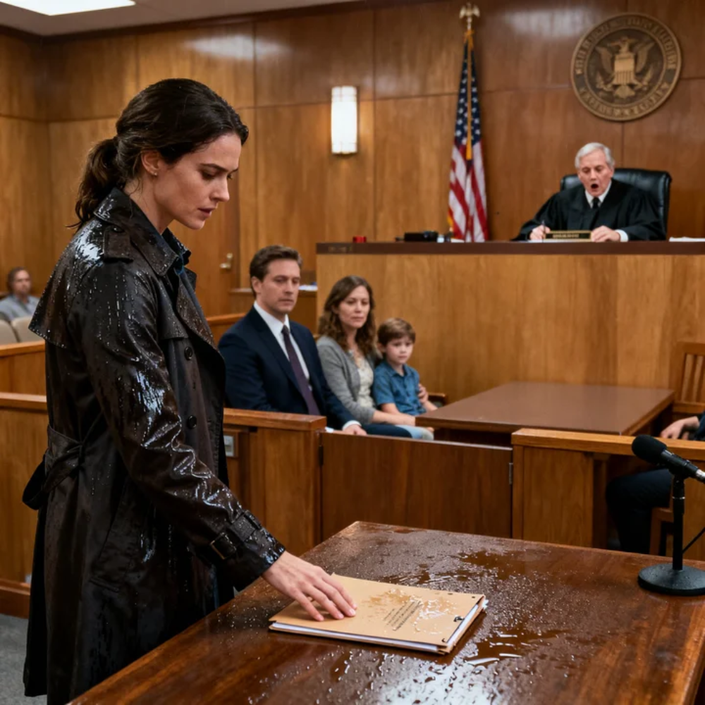 I didn’t stop to argue. I didn’t announce myself. I didn’t throw out some dramatic line about betrayal that would make the court reporter’s keys rattle with interest. I just walked to the respondent’s table—my table—and set the damp folder down carefully right in the center, letting the water-darkened edges show. Not because I wanted pity. Because I wanted the room to understand something without me saying it: