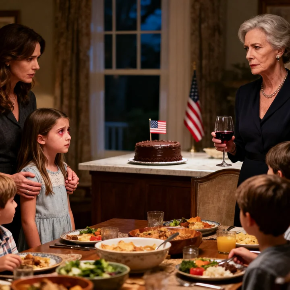 My daughter Emma sat beside me, her feet swinging under the chair because they still didn’t quite reach the floor. She was six years old, with light brown hair pulled into a loose ponytail and the kind of open expression that hadn’t yet learned how to guard itself. She had pushed her broccoli around her plate, clearly more interested in the chocolate cake sitting proudly on the kitchen counter, its glossy frosting catching the overhead light like a promise.