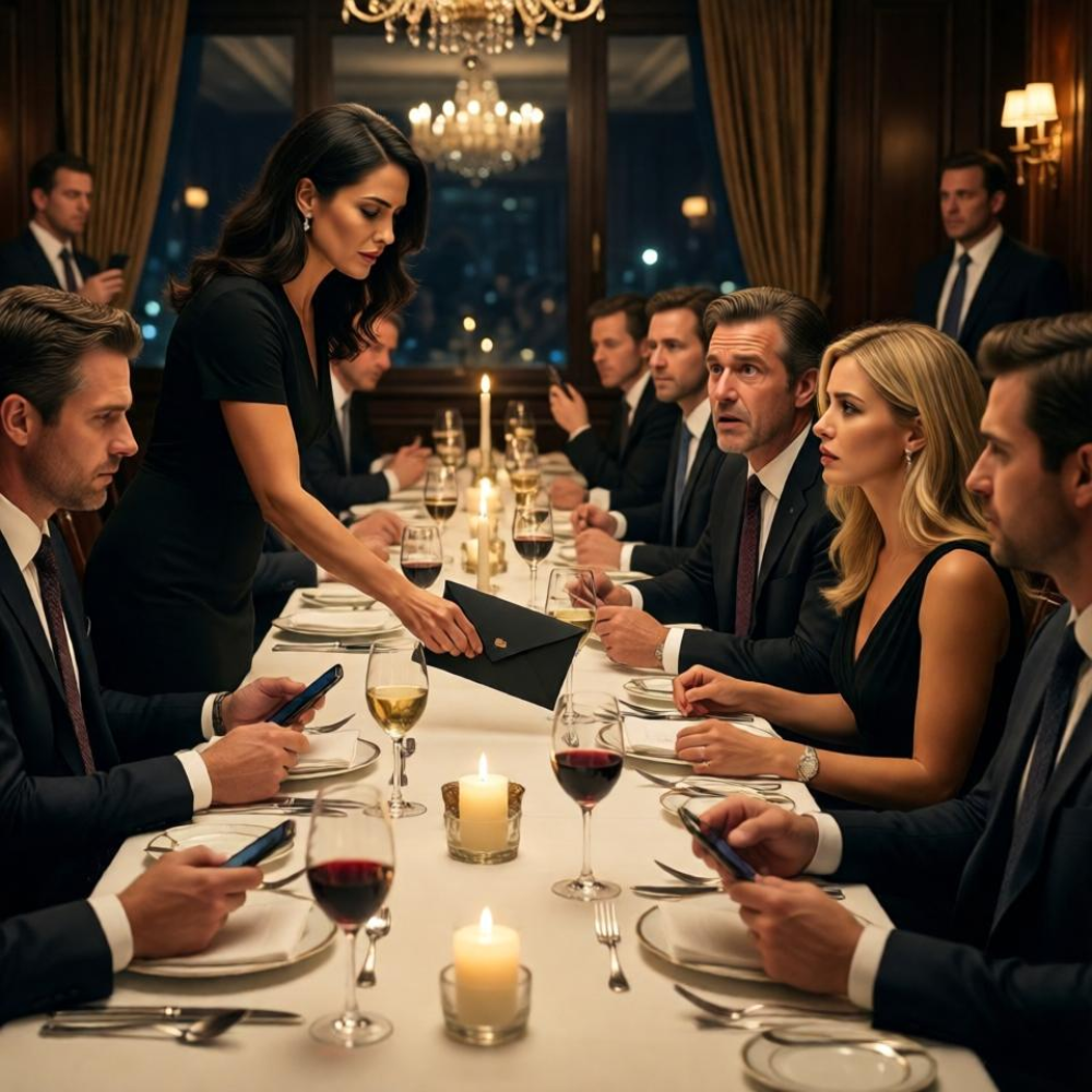 Phones began to vibrate across the table almost immediately, small mechanical tremors interrupting the illusion of control. A chair scraped loudly as someone stood too quickly. A glass tipped, spilling wine across a white tablecloth like a stain that could not be undone.