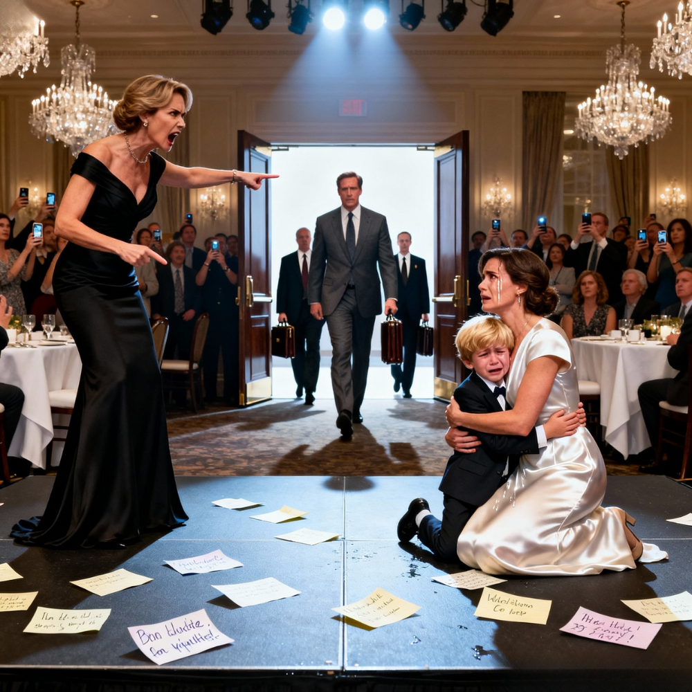 Hunter’s note cards slipped from his hands and fluttered to the stage floor like white petals. Then he jumped down and ran straight into my arms. He buried his face in my dress and cried the kind of cry that doesn’t sound like sadness—it sounds like a small body trying to survive humiliation.
