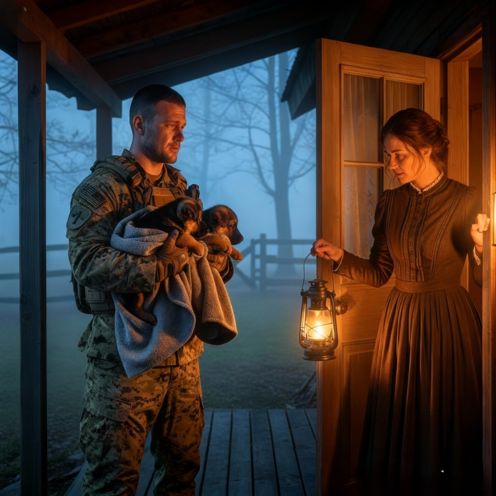 Clutched against his chest was a soaked wool blanket. Inside it, two tiny shapes moved weakly. Abby tilted the lantern, light spilling over two newborn German Shepherd puppies, no more than days old, their small bodies trembling, noses pressed together for warmth.