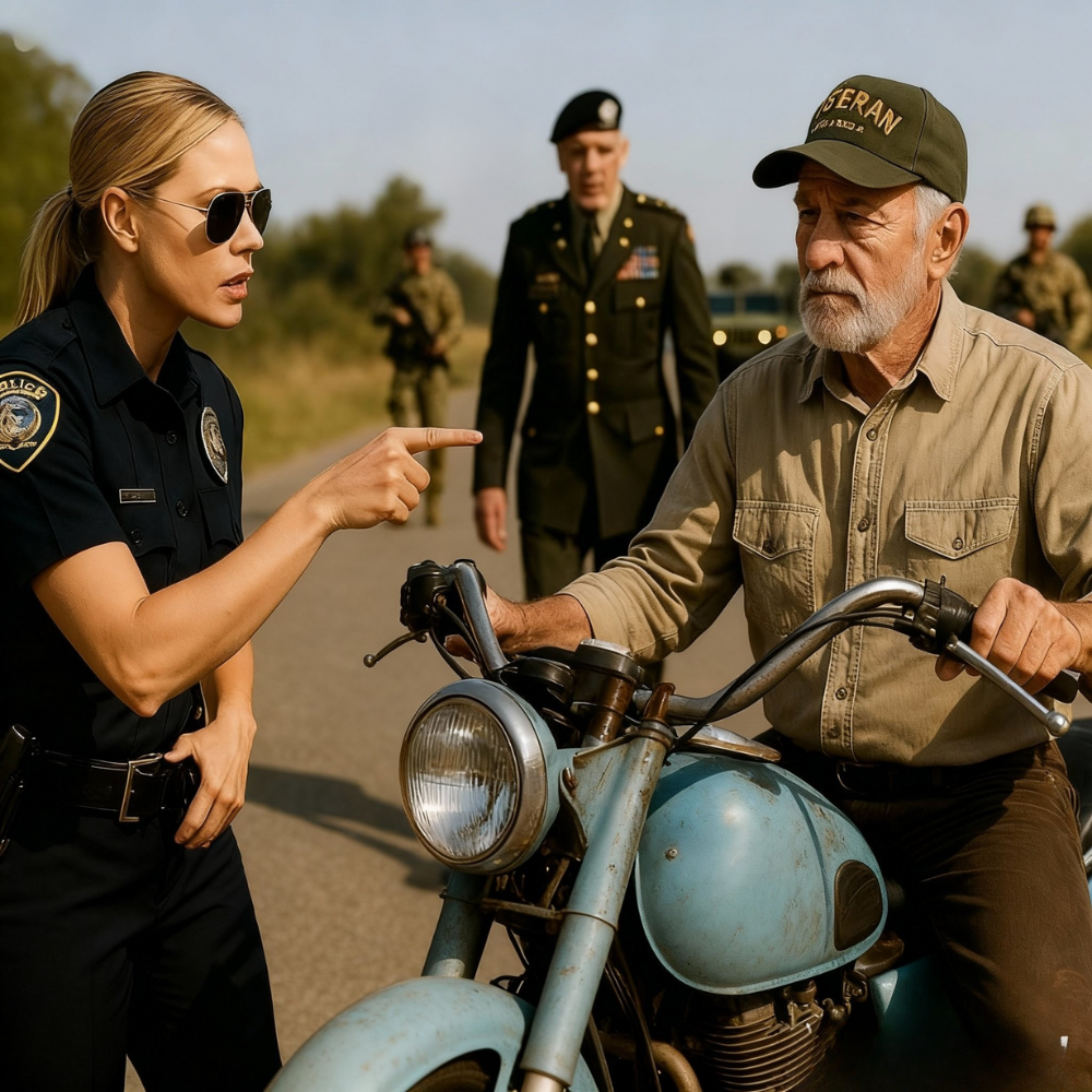 She walked toward the bike with long, confident strides, one hand resting lightly on her holstered weapon. The mirrored lenses of her sunglasses reflected the image of the old man and his motorcycle in perfect, metallic clarity. To anyone watching, it looked like the face of authority approaching the face of fragility.