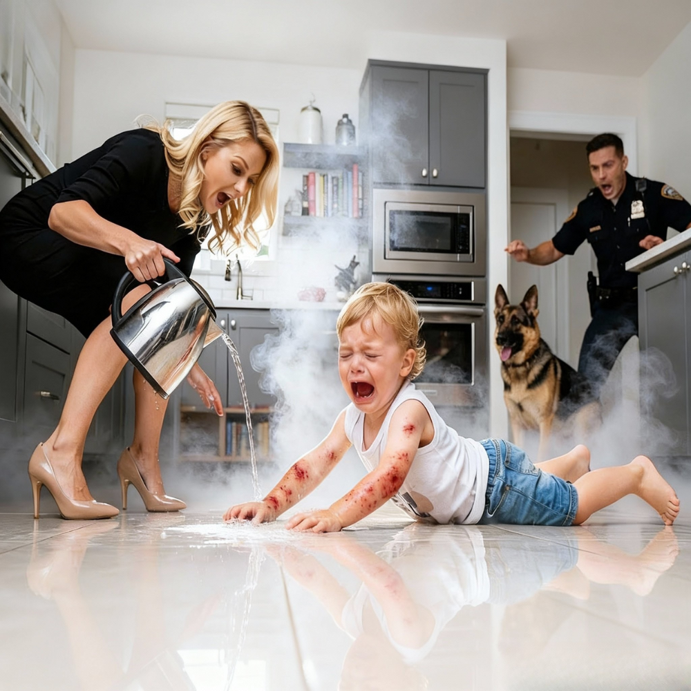 In one heartbeat, he registered everything: the boiling kettle, the boy on his knees, the angle of his wife’s arm, the look on her face that he had never seen before. His brain stalled, jammed between the image of the woman he thought he knew and the stranger standing over his child.